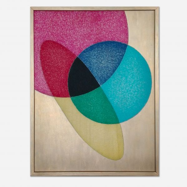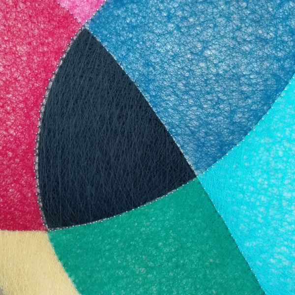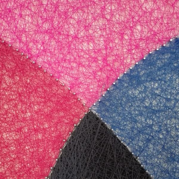 Barevné spektrum II. Obraz z nití na dřevěné desce se zlatým podkladem v pozlaceném rámečkuVelikost: š. 61 x v. 81cmCena: 5500 Kč