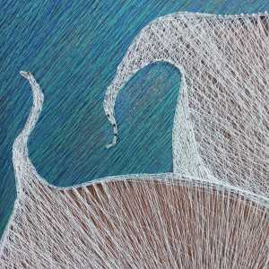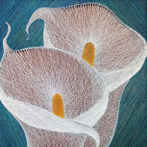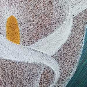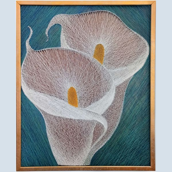 Dvě bílé kaly Obraz z nití na dřevěné desce ve zlatém rámečkuVelikost: š. 57 cm x v. 71 cmCena: 5500 Kč