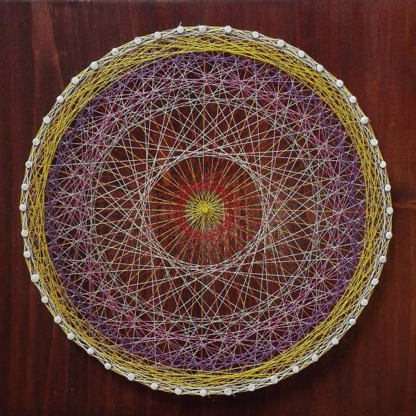 Obraz z barevných nití na dřevěném podkladě